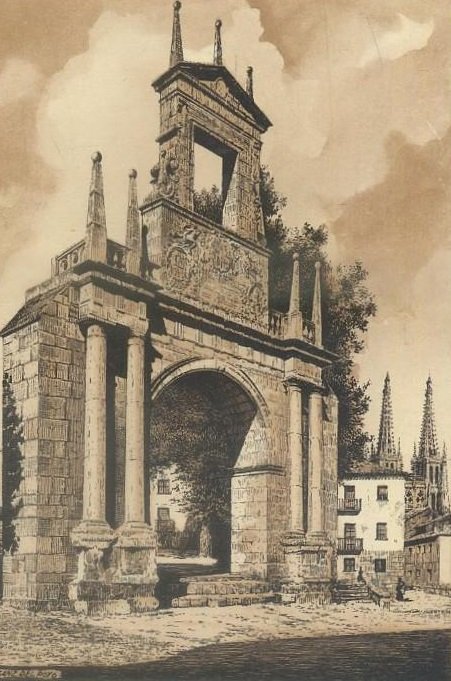 Descendiendo por la calle de Cabestreros tropezamos en una desigual plazoleta con una extraña edificación de espadaña y portada. Es el arco de Fernán González. Una secular tradición, nunca desmentida, afirma que en este solar tuvo su palacio el Conde soberano. Reinando Feipe II la ciudad erigió este monumento y el maestro Juan Ortega de Castañeda lo ejecutó. Fray Luis de León, presente entonces en Burgos, escribió la lauda central.