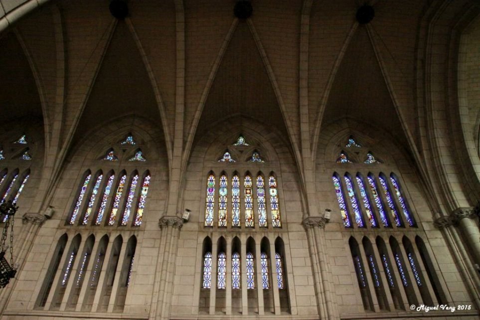 En el interior consta de tres naves, siendo la central más alta y ancha que las laterales, por encima de las cuales se abre un amplio triforio.
